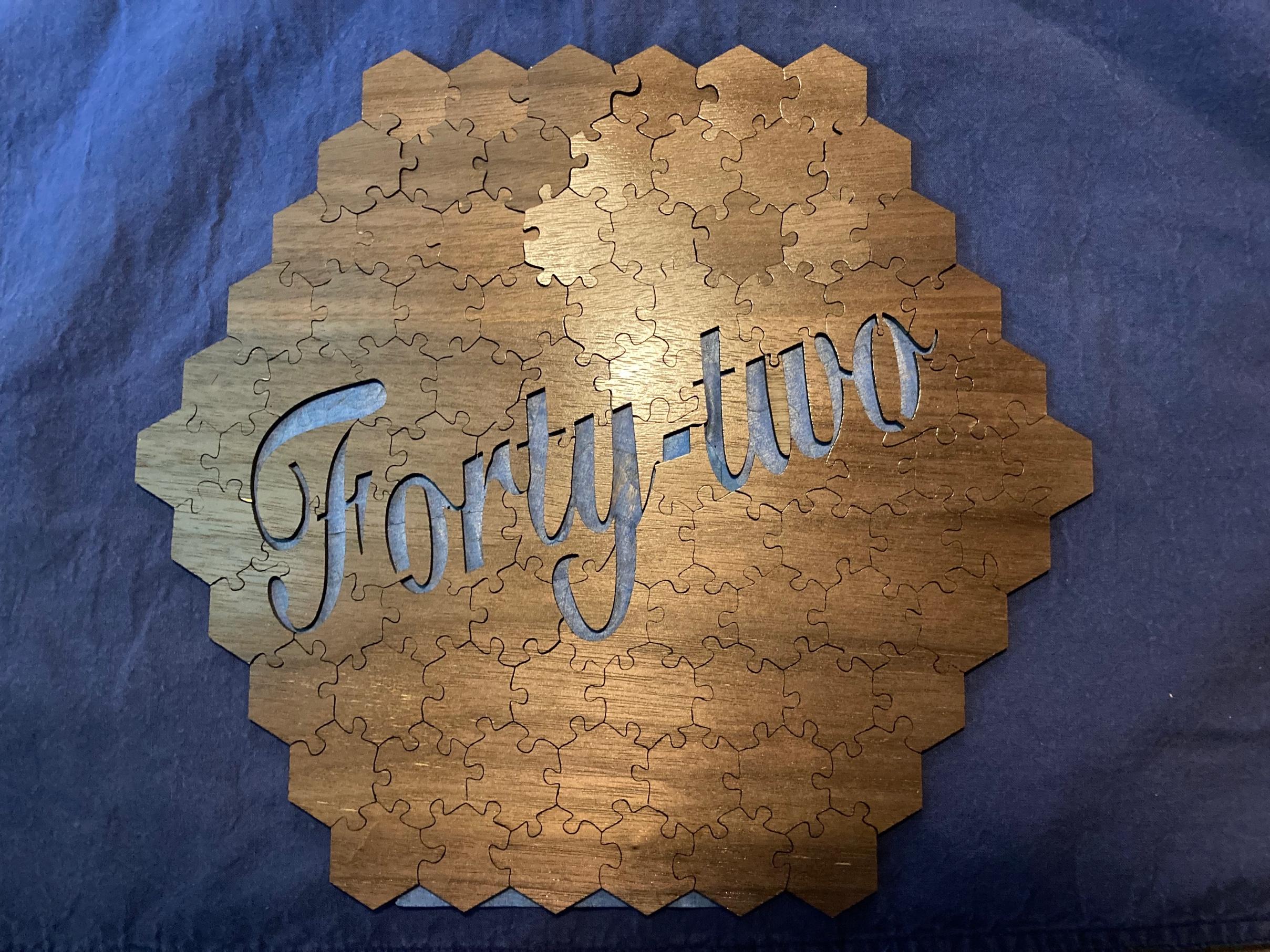 Inspired by Douglas Adams’ The Hitchhiker’s Guide to the Galaxy, this laser-cut wooden jigsaw spells out FORTY-TWO using a striking hexagonal grid – from the individual pieces to the final completed form. With 100+ large hex pieces and a rigid grid structure, this puzzle demands patience, logic, and a willingness to embrace complexity. Shown in walnut.